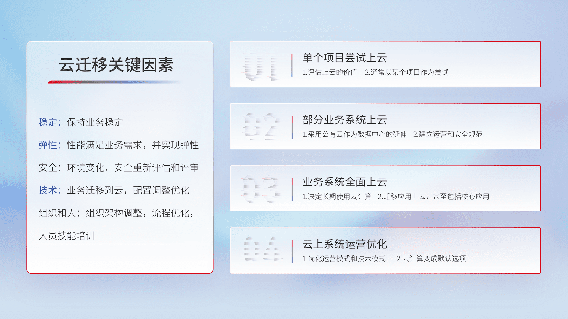 结合实际业务,,,从规划设计、、云平台选型、、、云原生改造、、、数据迁移、、、集成交付,,,,迁移全过程为客户识别最佳上云路径,,,做好风险识别管理,,,,设计网络架构、、、身份权限、、、安全审计合规、、操作审计、、、、日志审计、、、、监控告警策略、、、多站点容灾设计等,,,对云上基础设施进行整体规划,,,提升IT治理水平,,,,以满足弹性、、、、高可用、、高性能的需求。。