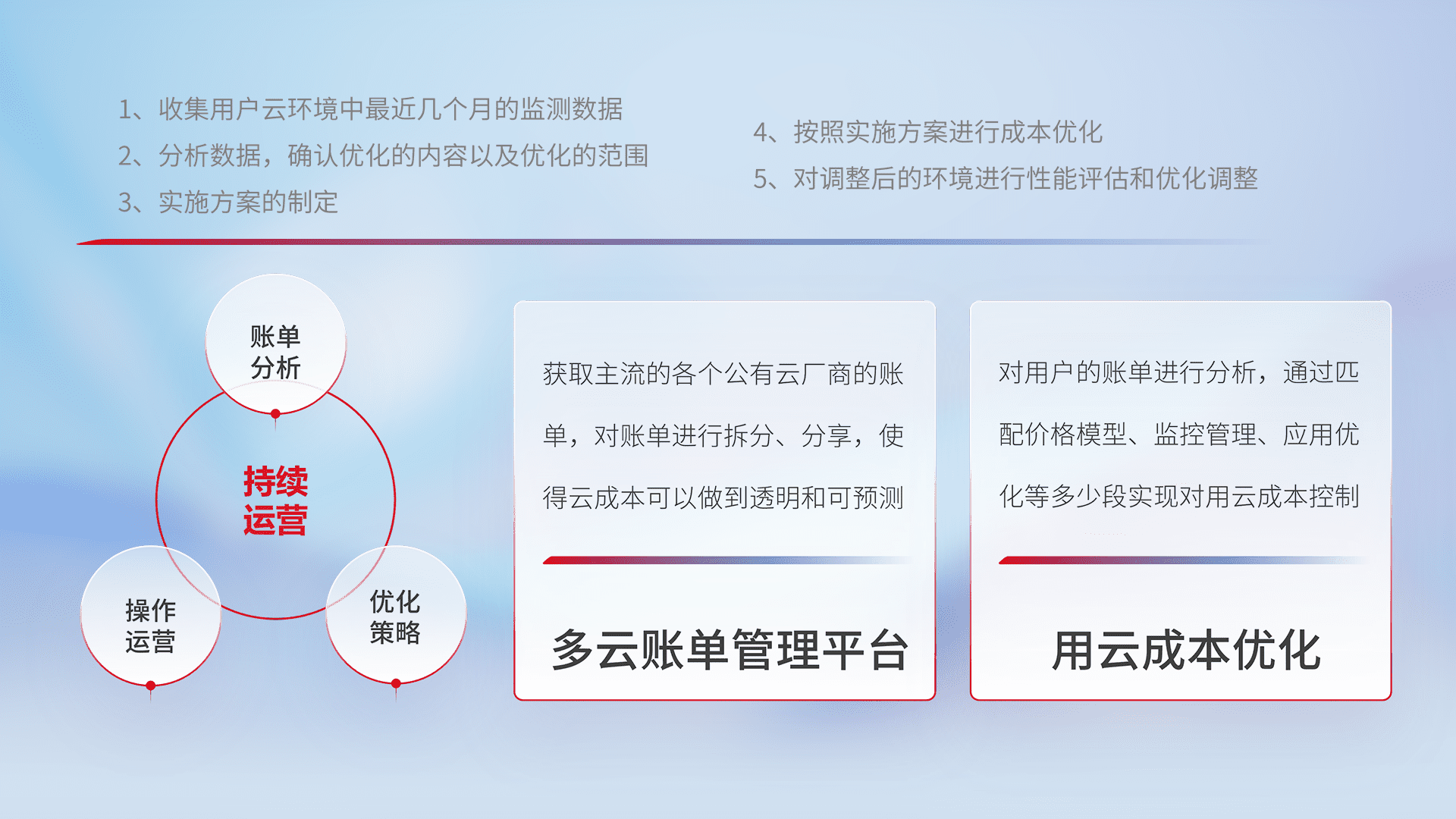 通过多云纳管,,,以统一的资源数据模型把客户的云资源进行抽象和封装,,进而实现对多云资源的统一操作,,保障云资源管理的可靠性、、、稳定性与可用性。。量身定制化运维内容,,配置、、开发运维、、、、补丁管理、、备份、、、监控、、、、认证和访问管理、、、、审计和日常巡检等,,,,保障在用云过程中的可靠度,,稳定度以及高可用率。。。